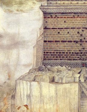 This tower, set in the midst of very dark, unwelcoming landscape, cannot arouse anything else but hopelessness and terror. Only three lines describing Barad-dûr leave us with the impression of the fortress strong, terrible and immense. The words are painting the picture of the construction monstrously tall, hard, indestructible, terrible. The repetition of the words connected by the preposition “upon” create a picture of the tower rising high, as if piling its elements on each other endlessly. Wall upon wall, battlement upon battlement: there seems to be no end to the Dark Tower. The same device is used by Tolkien elsewhere when we see Barad-dûr and “all its great stronghold, gate on gate, and tower on tower” (Return of the King, p. 235).