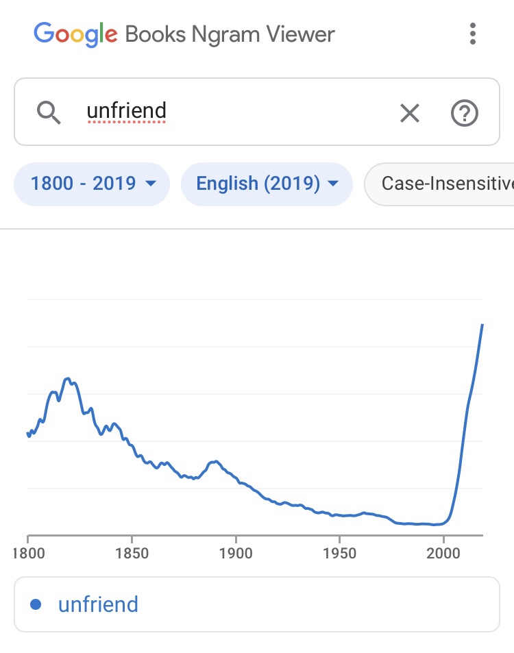 To the modern reader the word unfriend is most likely known as a verb which means ‘to remove contacts from a friend list on social networks, like Facebook’. The word itself, however, is much older than any social network imaginable and originally meant something different. Starting with circa XVI century the word’s documented appearances were mostly as either a verb, or a past participle, including in Shakespeare’s Twelfth Night, to denote lack of friends or friendly relationship.